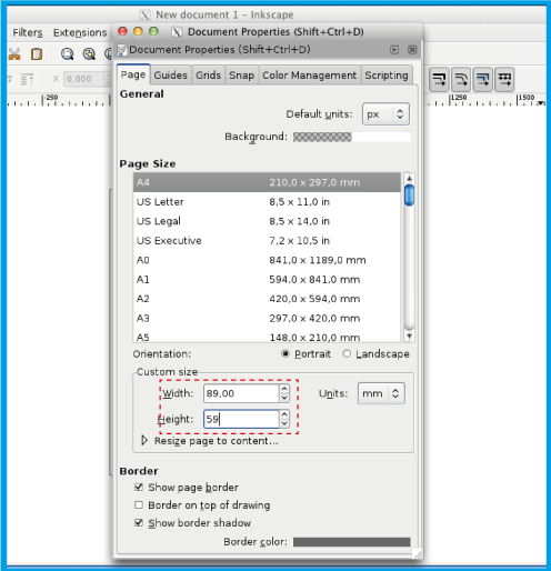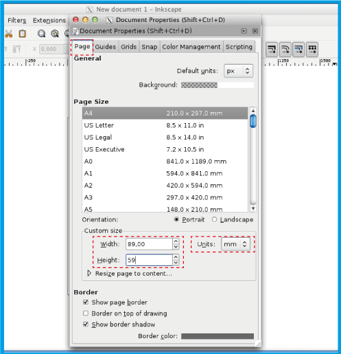 .Assurez-vous d’ajouter 4 mm (0,4 cm) à la hauteur et à la largeur de votre document. Dans le cas de la carte de visite 8,5 x 5,5 cm, insérez 8,9 x 5,9 cm..